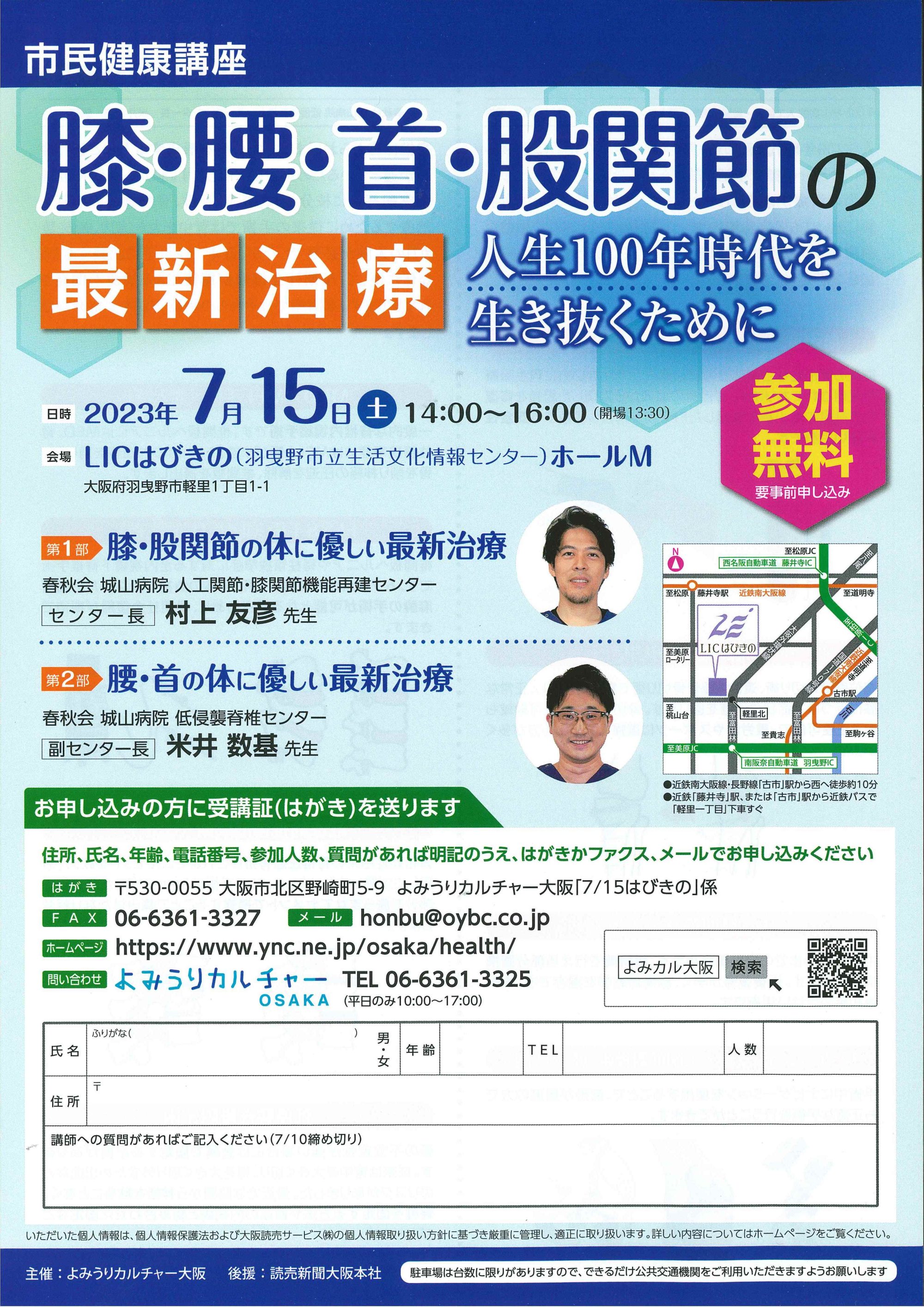 膝・腰・首・股関節の最新治療 ~人生100年時代を生き抜くために~ 第一部 人工関節・膝関節機能再建センター センター長 村上友彦 膝・股関節の体に優しい最新治療 第二部 腰・首の体に優しい最新治療 低侵襲脊椎センター 副センター長 米井数基 |